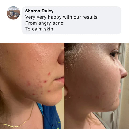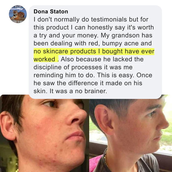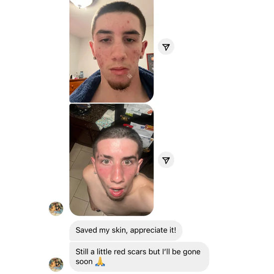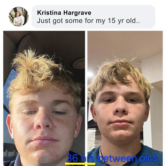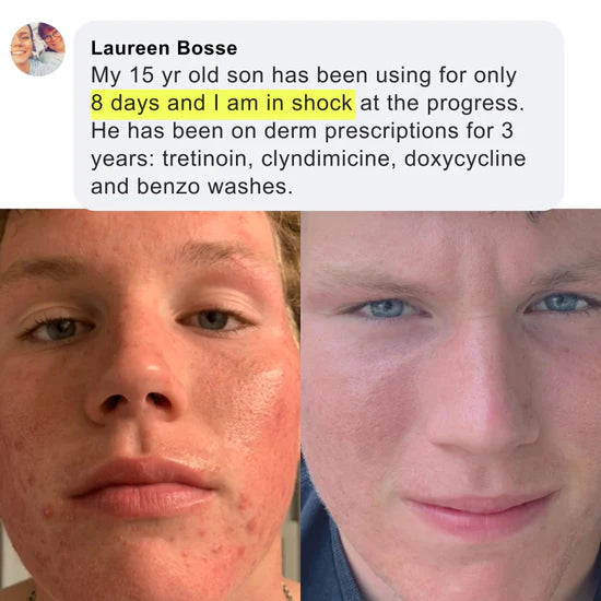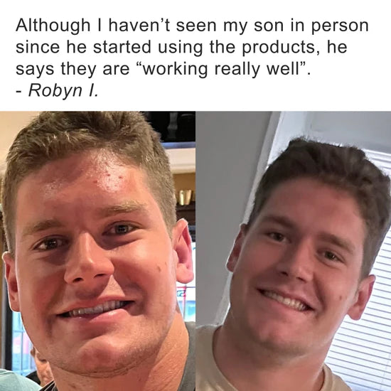 I have to tell you how much your products have helped my son in just the first week alone. I'm so happy we take progress pictures to show the improvement! My son has scarring from very painful cystic acne and your acne ritual is really helping to fade the scars. He will still get a tiny pimple every now and then but they are so tiny and go away in the next day or two. We are loving the progress so far. Thank you!!