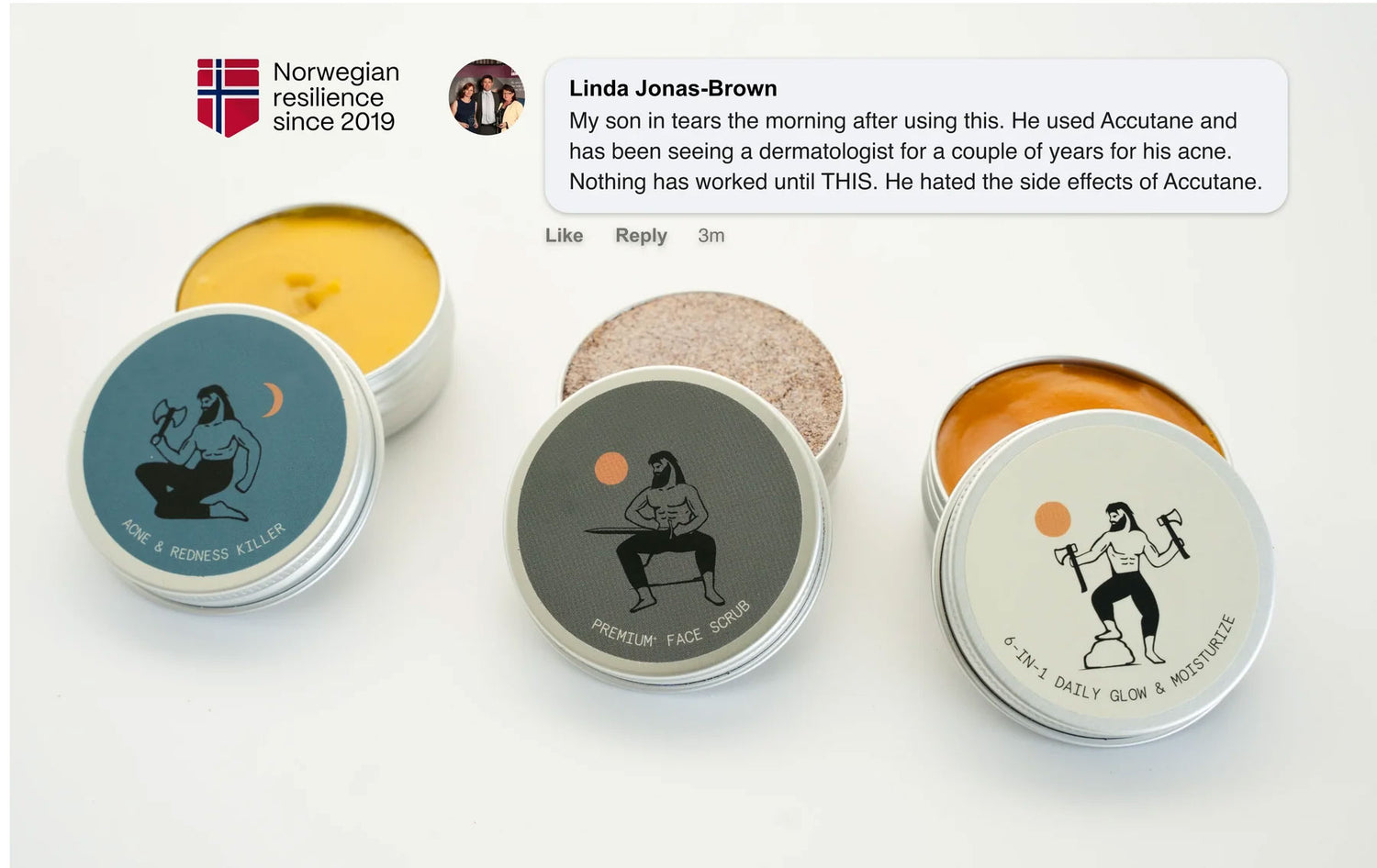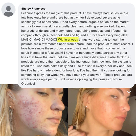 Norse is unlike anything you have ever seen or felt. Look at the products. Pure plant extract and arctic beeswax mixed together purely to take care of your acne once and for all. No cheap fillers or BS. Look at our reviews. No brands have reviews like us. We have helped 500,000+ REAL people.