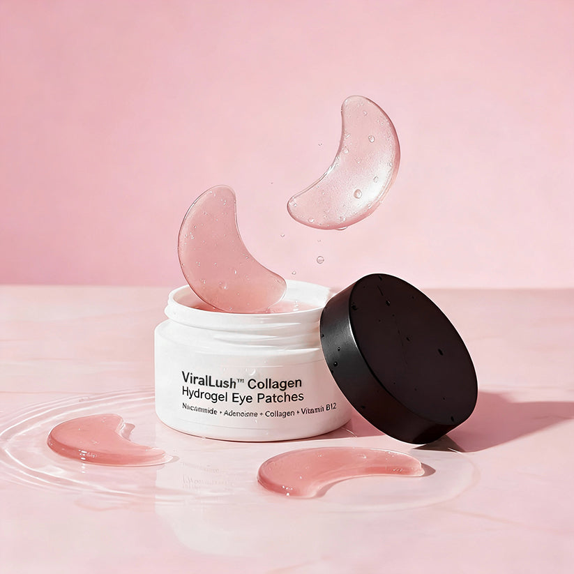 Watch your eyes transform within just 10 minuteswith our ViralLush™ Eye Patches. The only 5-in-1 solution that tackles every sign of eye fatigue:Caffeine depuffsandawakens,Niacinamide brightens dark circles,Adenosine smooths fine lines,Collagen firmsandlifts,Vitamin B12 revitalizes tired skin.
