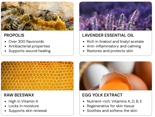 Egg yolk extract and propolis activate skin healing and soothe discomfort.
