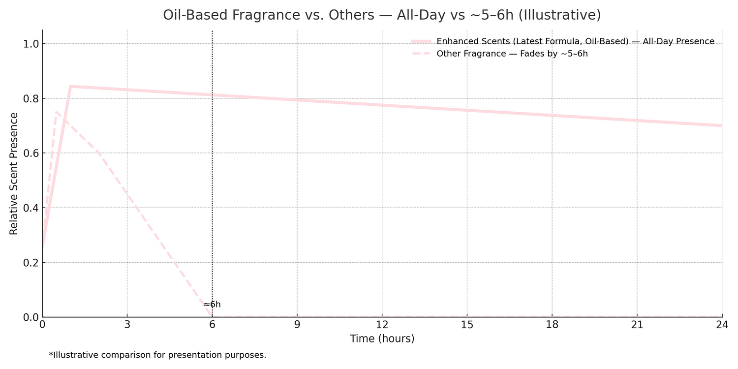 Our pheromone-infused perfume oil is crafted to work with your body heat and chemistry. The natural jojoba-oil base slows evaporation so scent and pheromones release steadily for about 6 hours on pulse points. As it warms, a bright yuzu & pomegranate opening blooms into a soft peony & lotus heart, creating a feminine, magnetic trail that feels confident and effortlessly attractive.